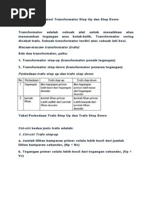1 pengertian trafo atau transformator. Trafo step up dan step merupakan pengelompokan jenis trafo berdasarkan level tegangan. Trafo memiliki dua bagian lilitan yaitu lilitan primer dan lilitan sekunder, dengan inti didalamnya. Perbedaan antara transformator step up dan trafo step down adalah, pada bagian tegangan listrik yang dihasilkan, dimana trafo step up justru pada outputnya . Lihat apa yang dikatakan komunitas dan buka kunci lencana.
